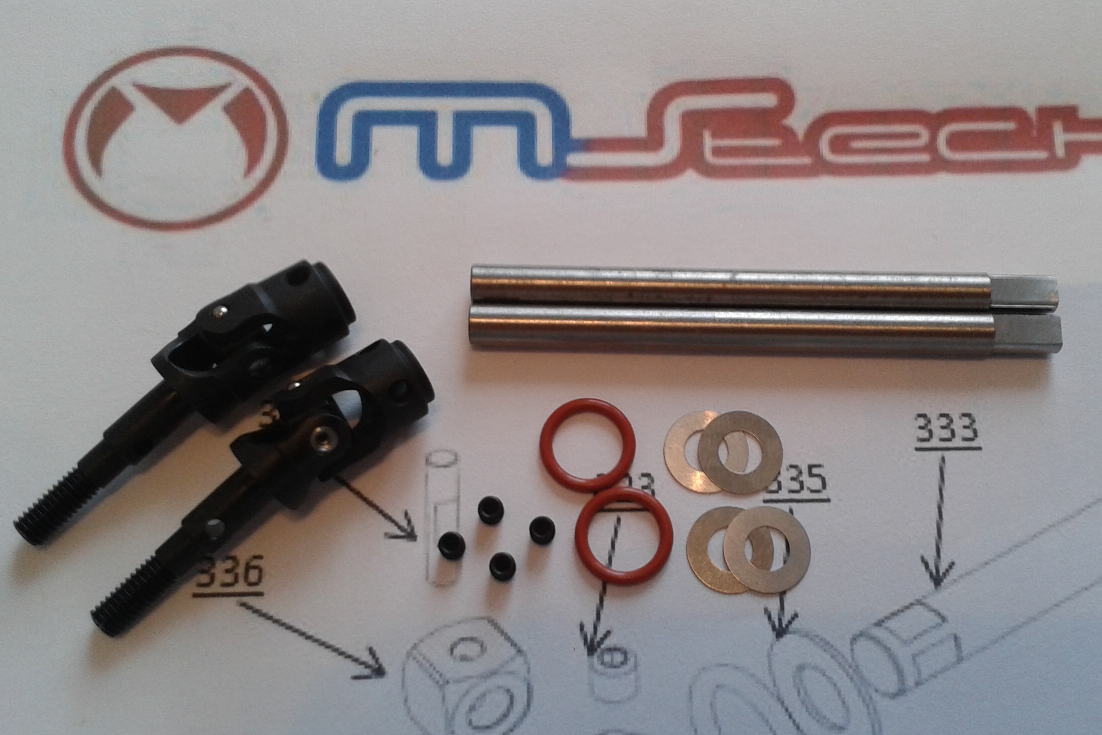 Kardanové poloosy UNI, pro nápravy Axial. Určeno pro stavitele vlastních náprav, nebo pro úpravce náprav Axial, kteří upravují šířky náprav a standartní poloosy jsou pro ně nevyhovující. Dodáváno v částečně rozebraném stavu. Možnost nastavení vlastní délky kardanové hřídele. Je zapotřebí po zkrácení dodávané hřídele na potřebnou délku vytvořit nové plošky pro červíky, například pomocí třískového obrábění. Za takto samodoma upravené poloosy nenese výrobce žádnou záruku!